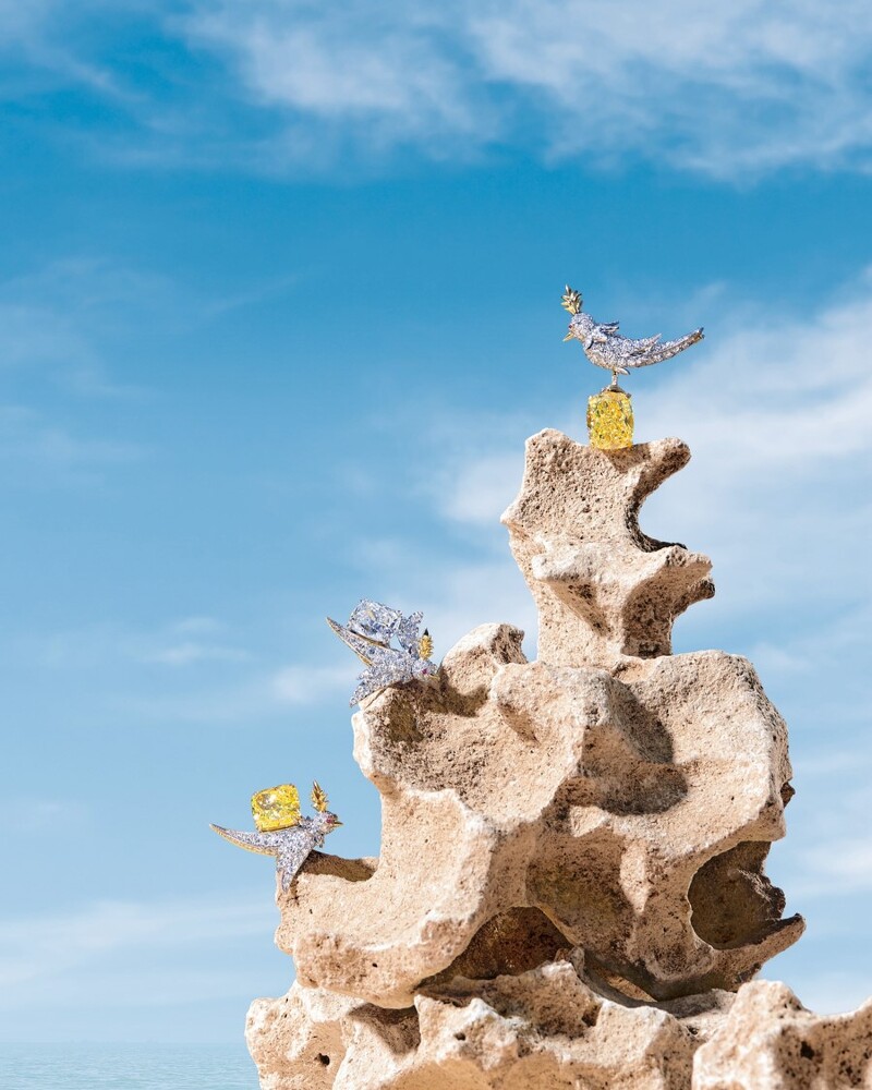 作为Tiffany & Co.蒂芙尼及史隆伯杰先生 (Jean Schlumberger)最隽永的代表作,石上鸟无论什么主题系列都从不缺席,这回也不例外,其中,以11克拉浓彩黄钻打造的胸针格外讨喜,晶莹璀璨的黄钻彰显作品俏皮气质,另一组分别以黄钻和白钻为主石的耳环,则以不同的姿态与造型刻画出鸟儿嬉戏的活泼气质。