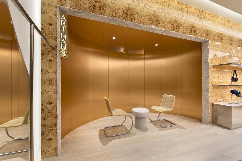 ART HAUS秉持一向注重艺术品味的装潢,这回A9新门市邀请到设计,一走进店里先是被特殊的陈列方式吸引,正中间衣桿是弯曲的流线形状,后方的木纹墙面则布满了树瘤的特殊纹路,并且透过钢琴烤漆呈现出亮面光泽,处处细节都与大自然的概念环环相扣。